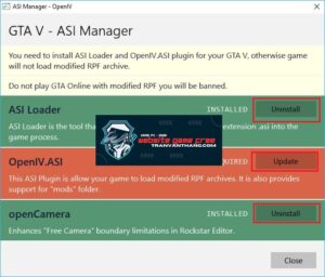 Bước #6: Sẽ có một cái bảng như bên dưới. Bấm Uninstall 2 cái ASI Loader và openCamera. Bấm Update OpenIV.ASI sau khi nó hiển thị ra chữ Uninstall thì nhấn uninstall luôn nhá.